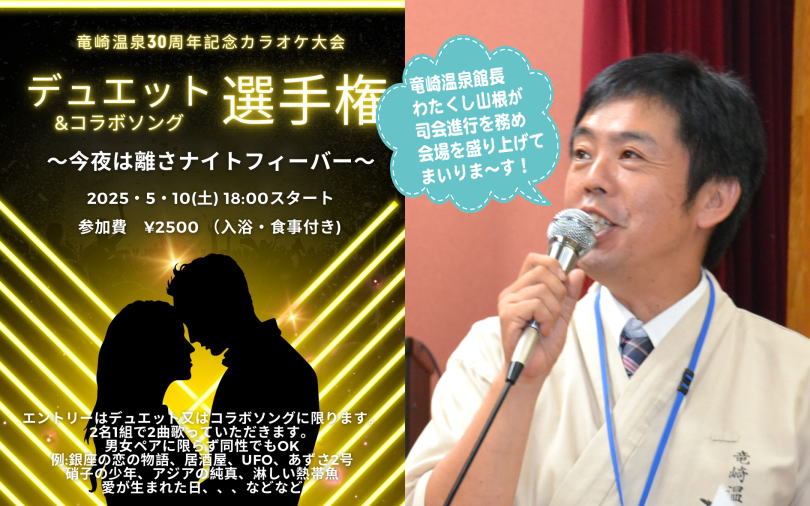 今回は竜崎温泉30周年を記念して「デュエット&コラボソング選手権」が開催されます。