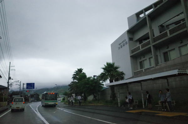 | 梅雨空の下、バスを待つ通学生。(小松) |