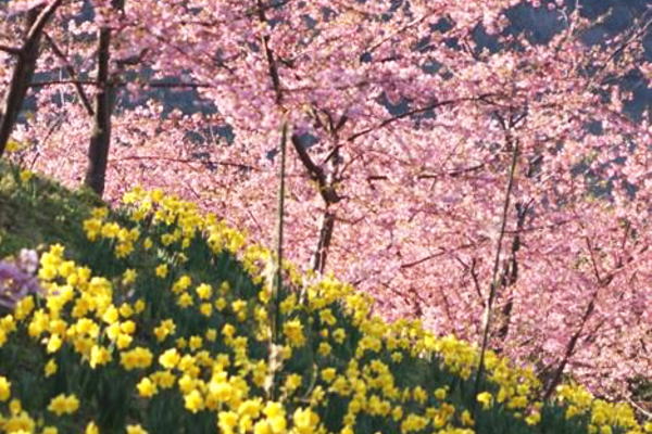雨上がりの青空と、鮮やかに萌える河津桜。(小積)