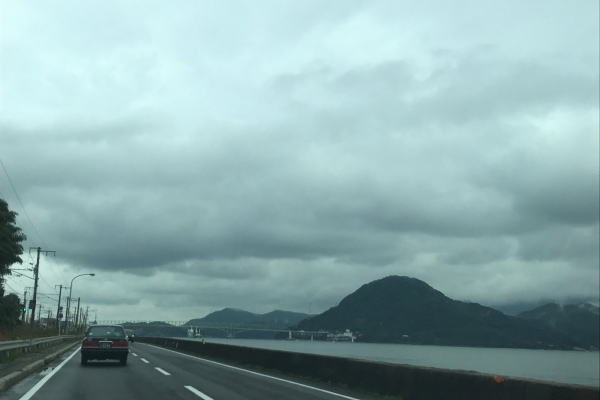 曇天に覆われた大島大橋と飯の山。(大畠)